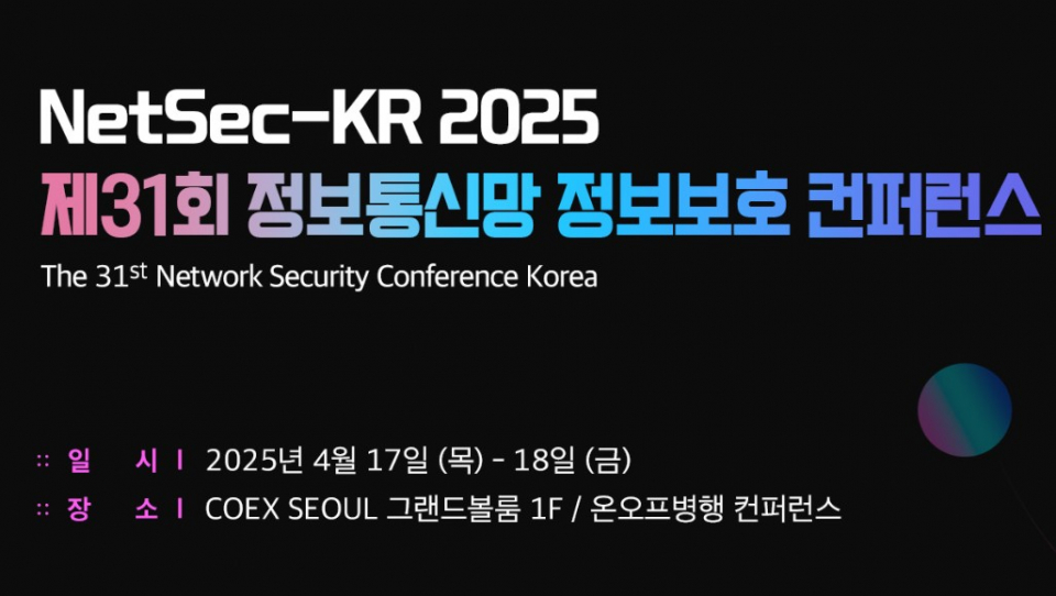 한국인터넷진흥원(KISA)과 한국정보보호학회(KIISC)는 오는 4월 17일부터 18일까지 양일간 서울 삼성동 코엑스 1층 그랜드볼룸에서 ‘제31회 정보통신망 정보보호 컨퍼런스(NetSec-KR 2025)’를 개최한다고 밝혔다.