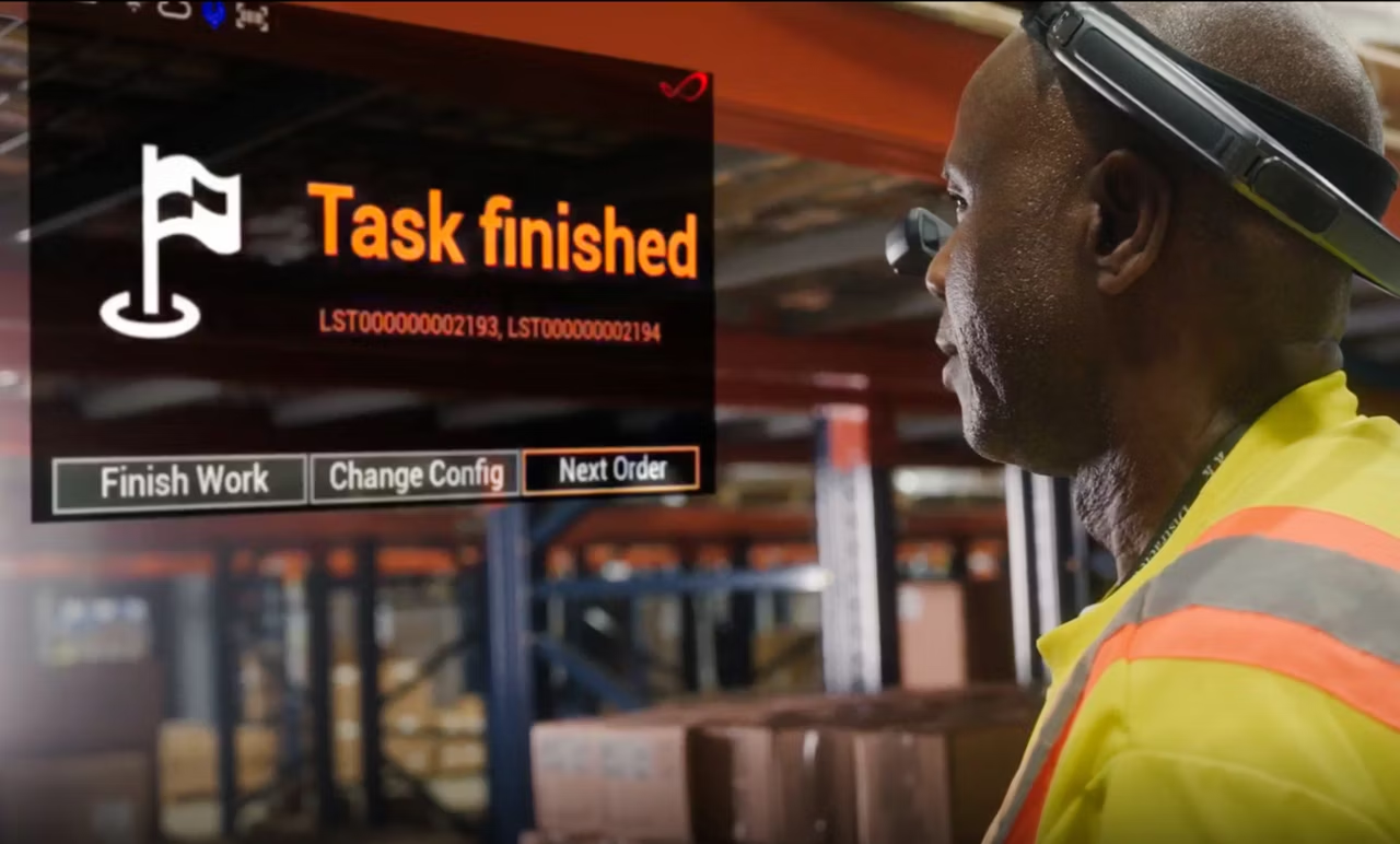 한 직원이 스마트 글래스를 끼고 화물창고를 돌아다녔어요.